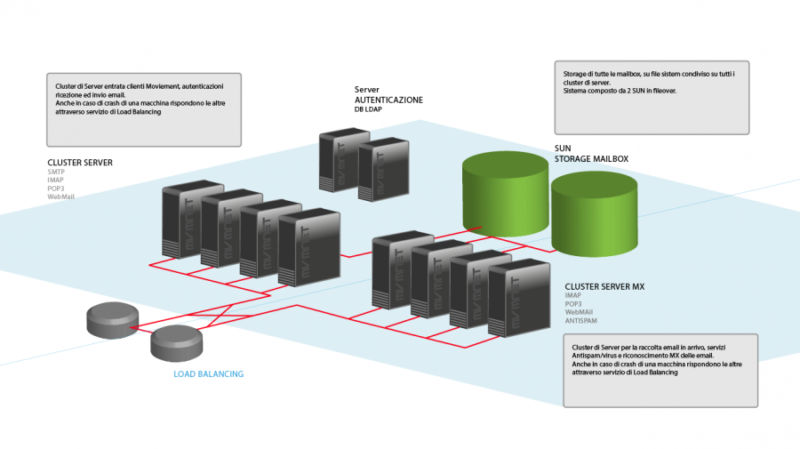 Un architettura propria per la gestione avanzata delle MAIL, un sistema completamente indipendente dai piani di hosting che vanta una notevole affidabilità, data dal bilanciamento dei carichi su due linee internet e numerosi server che si suddividono i carichi di lavoro del POP3 – Antispam – SMTP