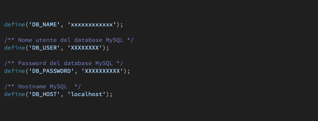 Nei file che hai scaricato precedentemente via FTP dovresti avere un file che si chiama config.php, aprilo con un editor spostati verso il basso fino a che non trovi la funzione define(‘DB_NAME’, ‘XXXXX’); define(‘DB_USER’, ‘XXXXX’); define(‘DB_PASSWORD’, ‘XXXXX’); al posto delle XXX che abbiamo messo troverai i dati del vecchio DB, devi inserire i nuovi dati che hai creato precedentemente. Fai attenzione a non cancellare apici o parentesi, sostituisci solo il contenuto dentro le XXXX. (vedi immagine sotto). Salva il file.
