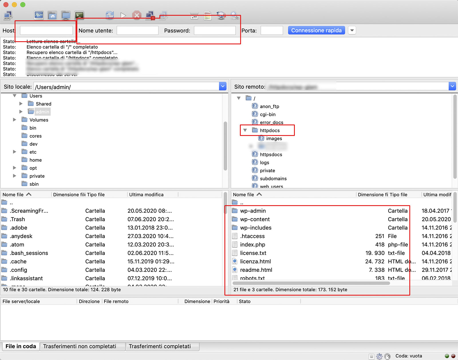 A questo punto dobbiamo trasferire tutti i file dal server remoto al nostro PC, per farlo potete usare un client FTP come Filezilla, ora dovete inserire i dati di accesso Host (indirizzo web del tuo sito) – Nome Utente e Password (quelli forniti dal tuo provider). Una volta connesso al sito a seconda del provider potresti entrare direttamente nella directory dove troverai tutti i file di WP, oppure nella root in questo caso i tuoi file sono nella directory httpdocs.